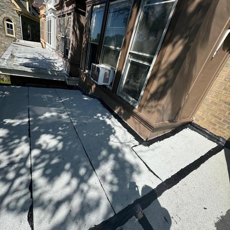 Umbrella Roof installed a Firestone Modified Bitumen flat roof system on a porch roof in Philadelphia's Haddington neighborhood. This installation enhances weather resistance, seals against moisture infiltration, and suits the area's seasonal climate challenges.
