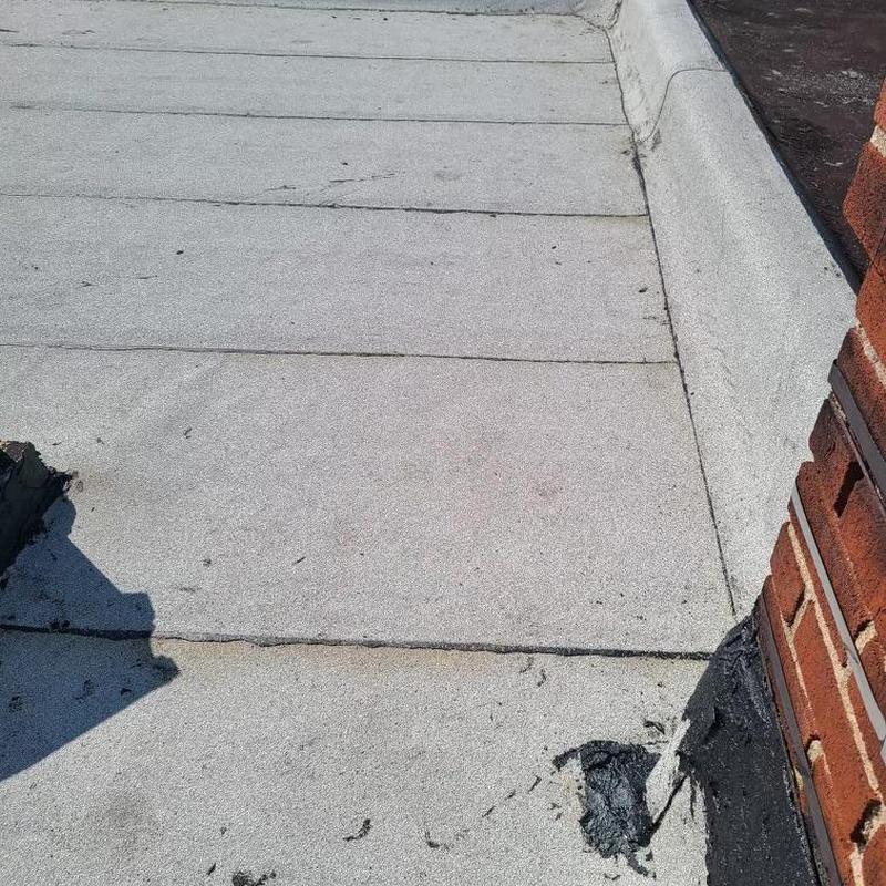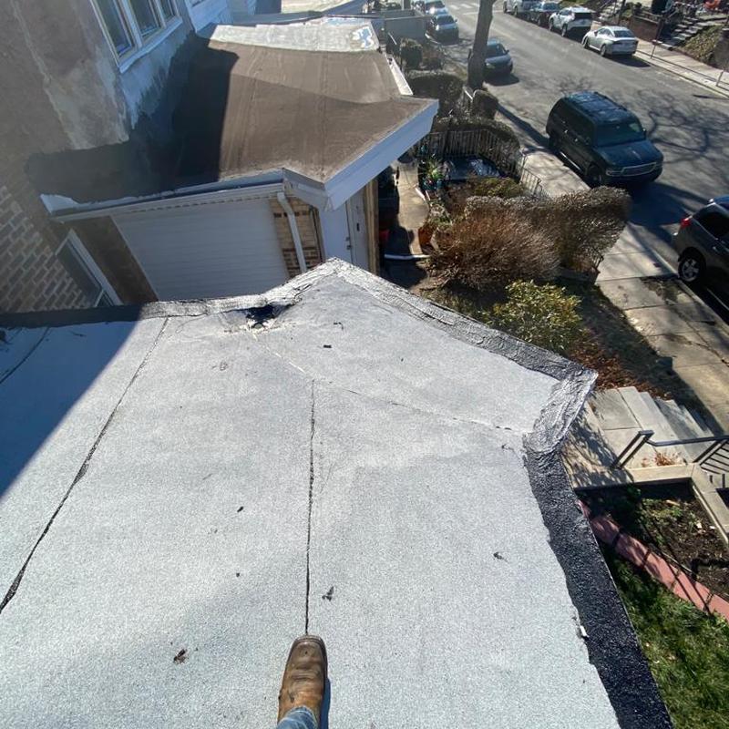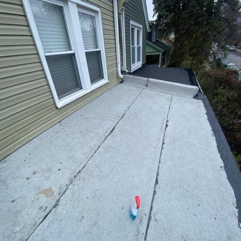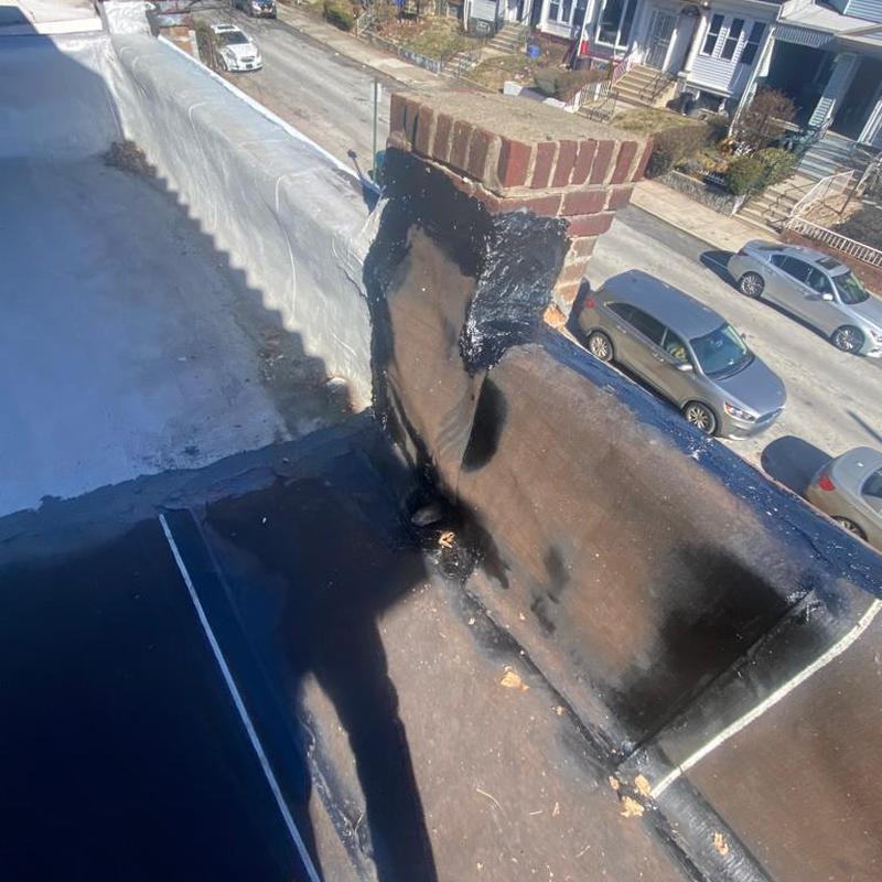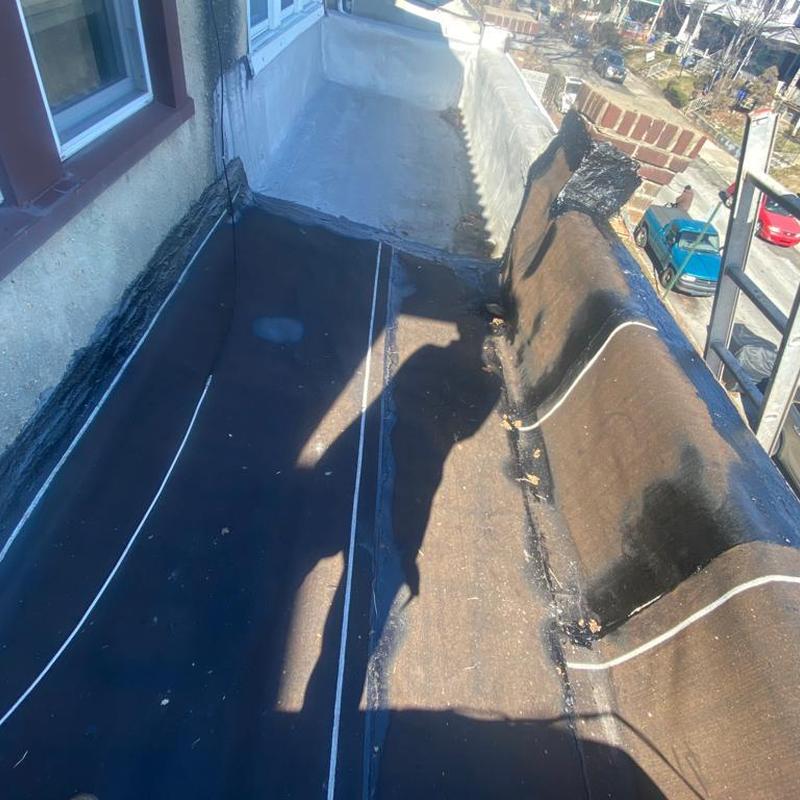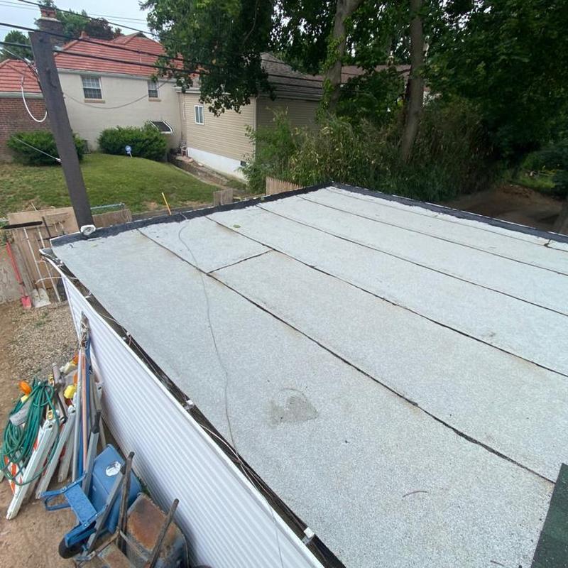 The Umbrella Roof team installed a new Firestone Modified Bitumen flat roof system on a porch roof in the Cobbs Creek neighborhood of Philadelphia, PA. This flat roof installation improves water resistance and durability for residential structures in urban settings.