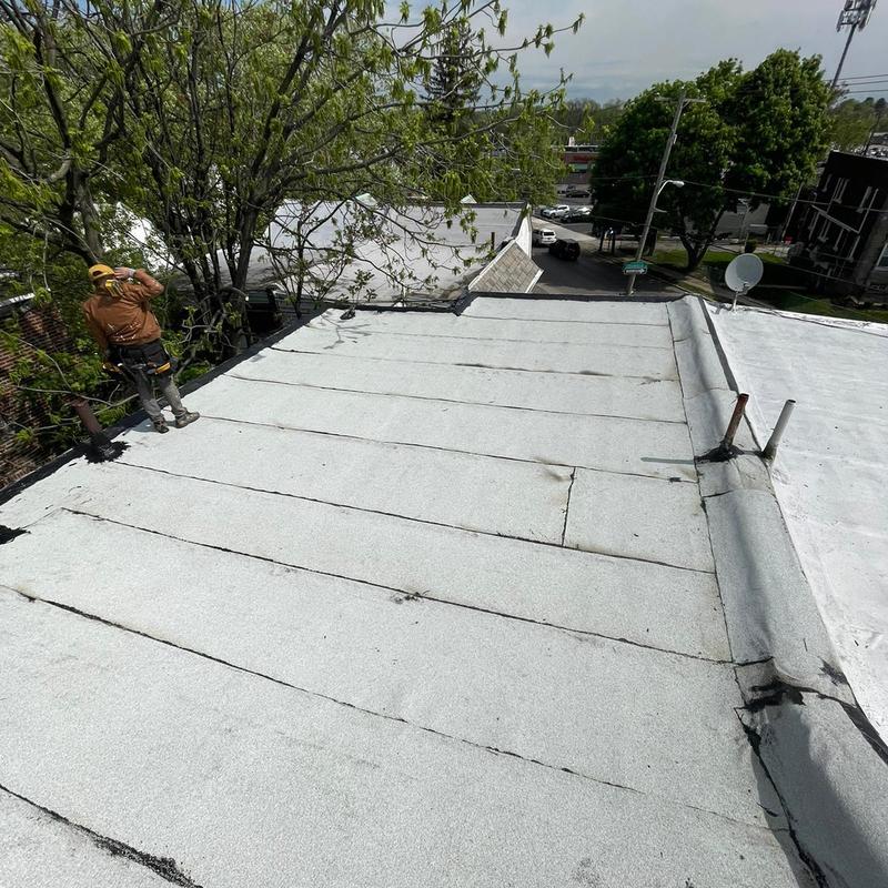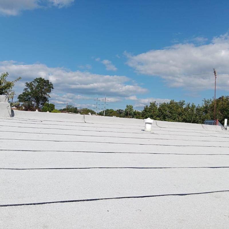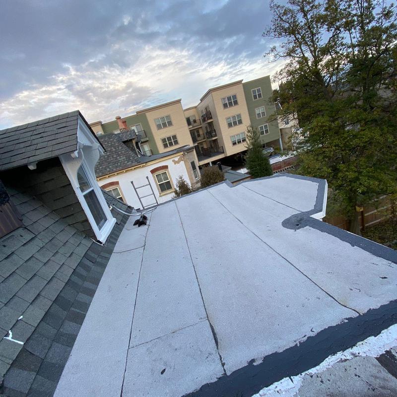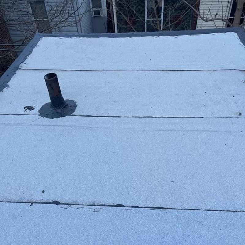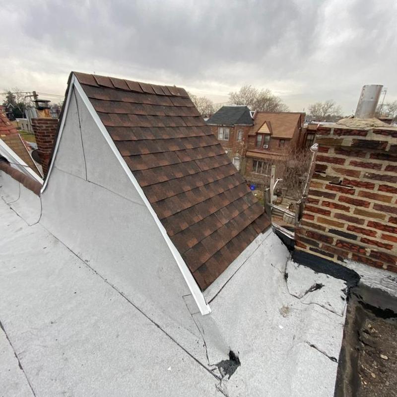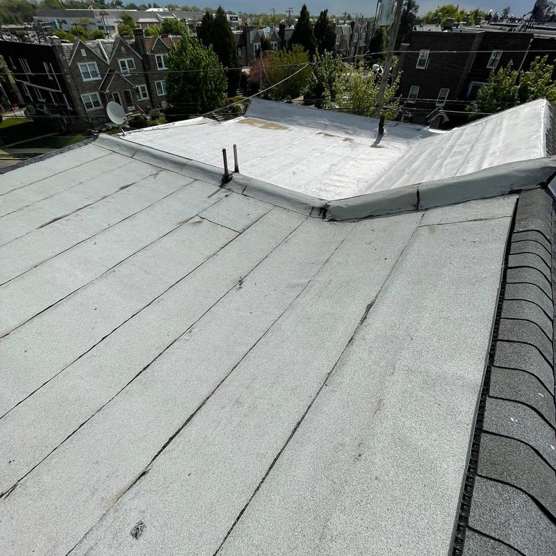 Umbrella Roof completed a shingle roof installation in Northeast Philadelphia, PA, using the GAF Timberline HDZ system on a mansard roof. The team performed flat roof maintenance by applying roof cement to edges, penetrations, and flashing, followed by an aluminum silver coat to help extend the roof's lifespan.