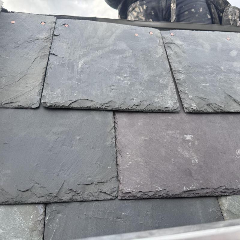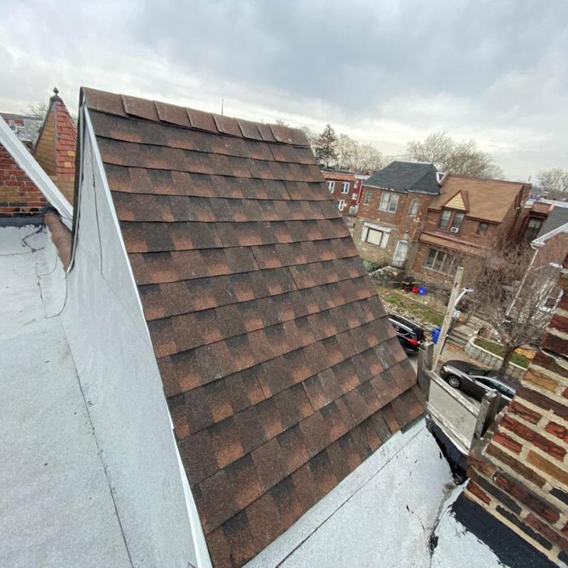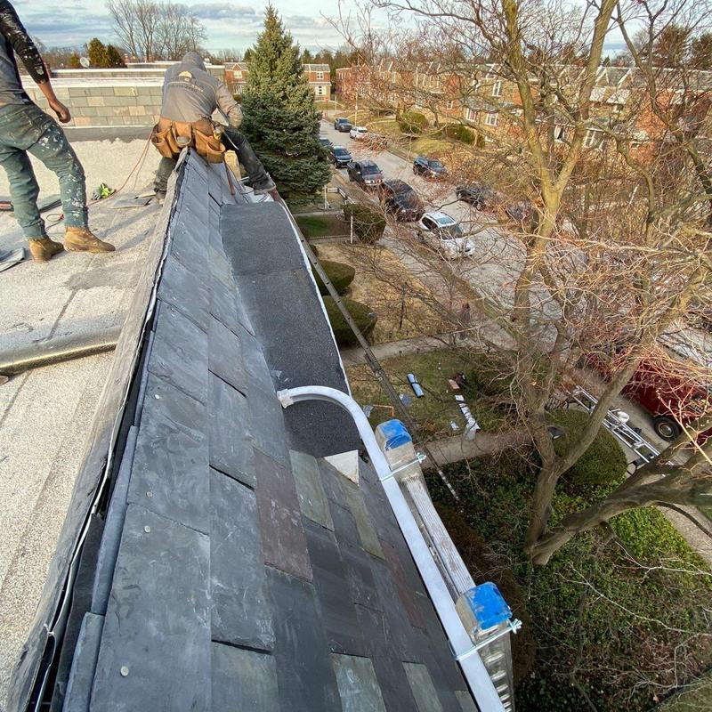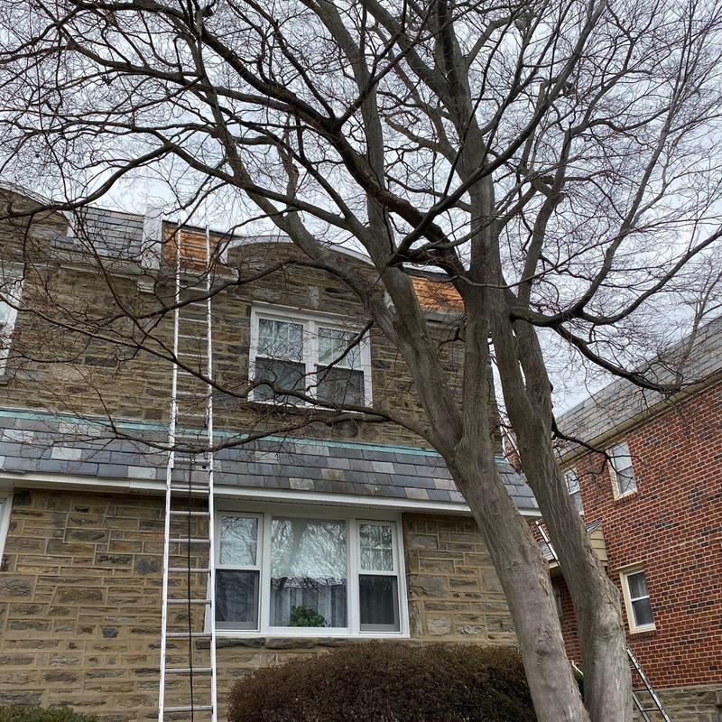 The Umbrella Roof team installed new slate shingles on mansard roofs and replaced the flashing during a shingle roof installation in the Cedarbrook neighborhood of Philadelphia, PA.