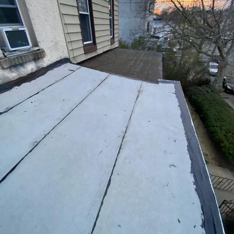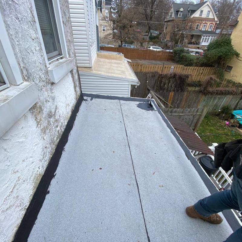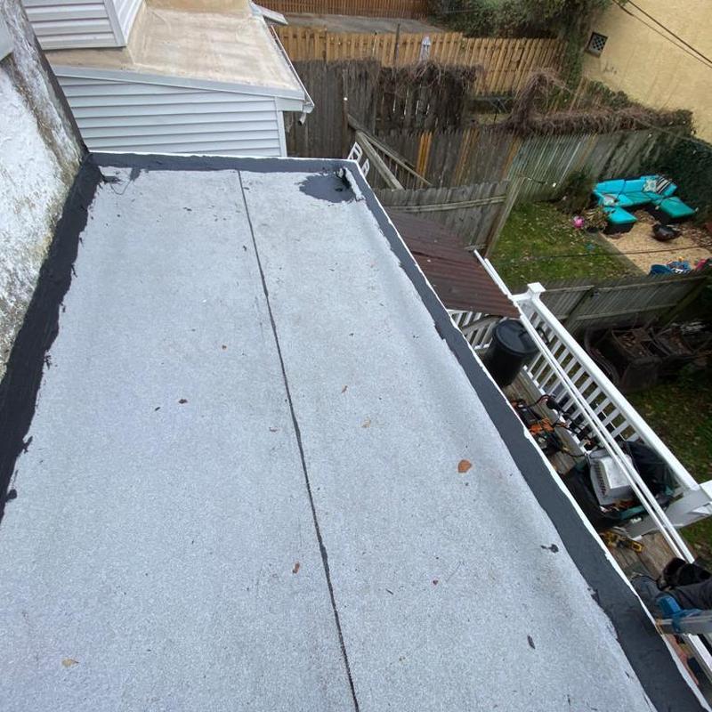 Umbrella Roof installed a Firestone Modified Bitumen flat roof system on a porch roof in Philadelphia's Haddington neighborhood. This installation enhances weather resistance, seals against moisture infiltration, and suits the area's seasonal climate challenges.