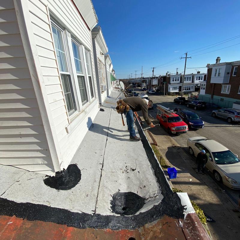 Umbrella Roof installed a Firestone Modified Bitumen flat roof system on a porch roof in the Carroll Park neighborhood of Philadelphia, PA. This flat roof installation improves water resistance and extends roof lifespan using durable, heat-sealed materials suitable for low-slope surfaces.